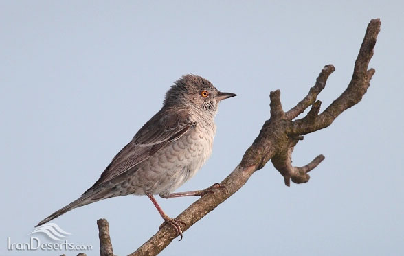 مشخصات ظاهری: این پرنده، 5/15 سانتیمتر طول دارد پرنده ی بالغ به رنگ خاکستری با زیر تنه ی راه راه هلالی (در پرنده ی ماده کمتر است) و عنبیه زرد رنگ است. دم نسبتا بلند؛ که هنگام نشستن آن را باز کرده و لبه ی آن را باز کرده و لبه آن به صورت آشکاری سفید است، دیده می شود. پرهای بلند دم و پرهای ثانویه ی بال به سفیدی متمایل است. پرنده ی جوان، در اولین پاییز، با چشمانی تیره، شبیه سسک باغی ، اما بزرگتر با سفیدی دم و لبه ی بال بی رنگ و اندکی رگه های تیره در زیر دم؛ دیده می شود. این رنگ آمیزی غالبا در بهار به چشم می خورد اغلب خود را لابلای بوته ها مخفی کرده و به سنگینی حرکت می کند.صدا: صدای این پرنده، شبیه سسک باغی و متنوع شبیه «ترررر» یا «چه - ار -ار-ار-ار –ار-ار» شنیده می شود.زیستگاه: این پرنده در بوته زارهای خار دار متراکم، پر چین های و درختان پراکنده با پوشش زیرین بوته ای به سر برده و لابلای بوته ها آشیانه می سازد. د رایران؛ تابستان ها اندک و به صورت مهاجر عبوری دیده می شود.حفاظت: ابتدا باید بررسی دقیقی از وضعیت پراکندگی این پرنده صوتر گیرد تا بر اساس آن، در صورت نیاز، برای حفاظتش برنامه ریزی شود.