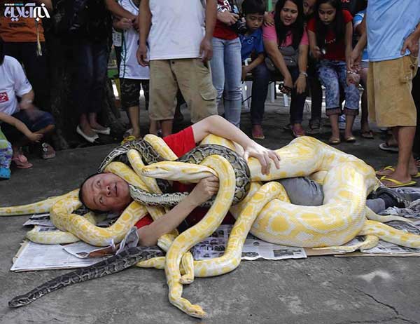 دیده بان حقوق حیوانات ایران: این مرد فیلیپینی در حال کشتی گرفتن با چند مار خطرناک و از جمله پیتون است. هر چند ۱۰ فوریه ۲۰۱۳ سال جدید چینی شروع می شود و چینی ها سال جدید را سال مار می دانند، اما این مرد از حالا به استقبال مارها رفته و در حرکتی نمایشی و البته مرگبار در حال کشتی گرفتن با مارها است.